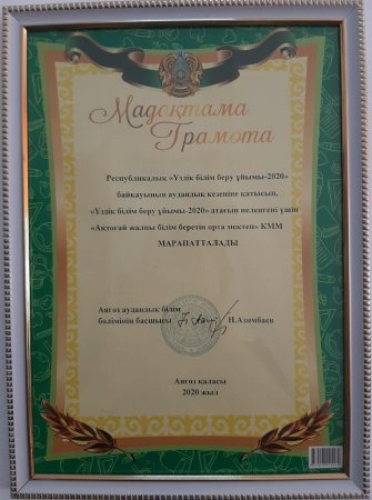 Республикалық "Үздік білім беру ұйымы-2020" байқауының аудандық кезеңі "Үздік білім беру ұйымы-2020" атағы
