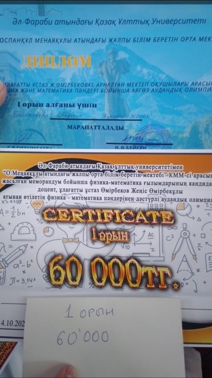 Әл-Фараби атындағы Қазақ ұлттық Университетімен "Меңаяқұлы атындағы жалпы білім беретін орта мектеп" КММ-і арасында жасалған меморандум бойынша физика-математика ғылымдарының кандидаты доцент, ұлағатты ұстаз Өмірбеков Жеңіс Өмірбекұлы атынан өтілетін физика-математика пәндерінен дәстүрлі аудандық олимпиадада І орын 10А сынып оқушысы Байғалиева Ардана.
