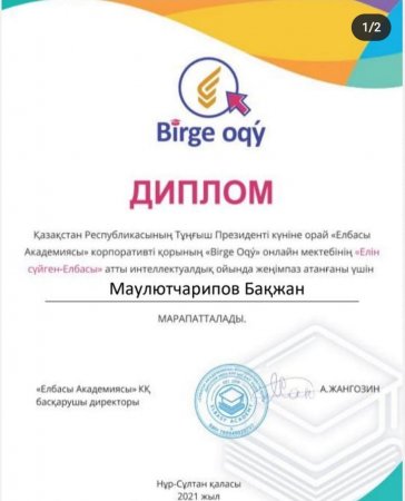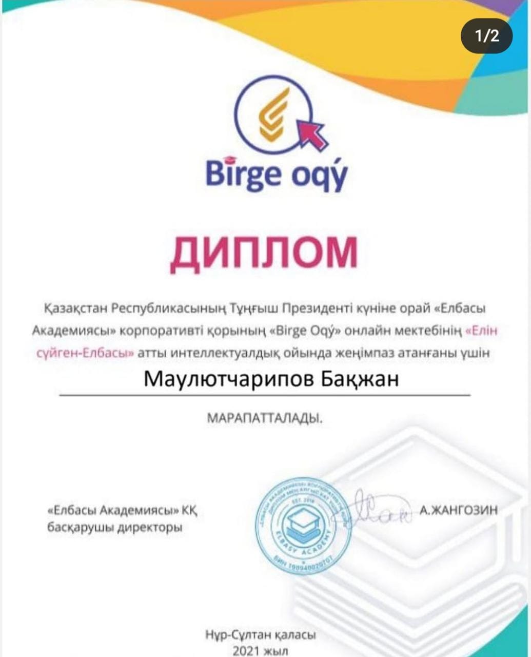 "Мың бала" олимпиадасының финалисті 7 "Ә" сынып оқушысы Маулютчарипов Бакжан 1 желтоқсан Тұңғыш Презеидент күніне орай ұйымдастырылған "Бірге оқу" - Қазақстандағы алғашқы онлайн мектептің "Елін сүйген-Елбасы" атты интеллектуалдық ойынының жеңімпазы атанды