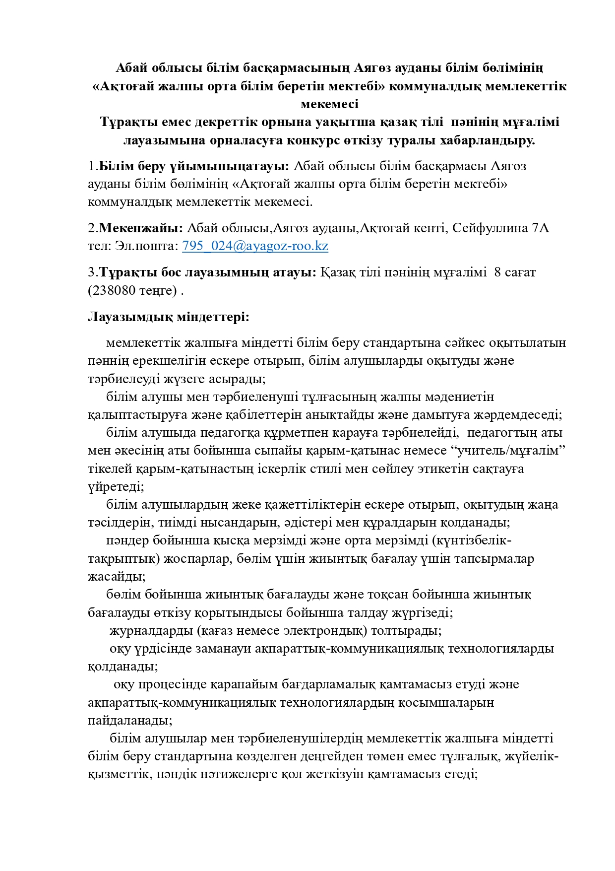 Абай облысы білім басқармасының Аягөз ауданы білім бөлімінің «Ақтоғай жалпы орта білім беретін мектебі»