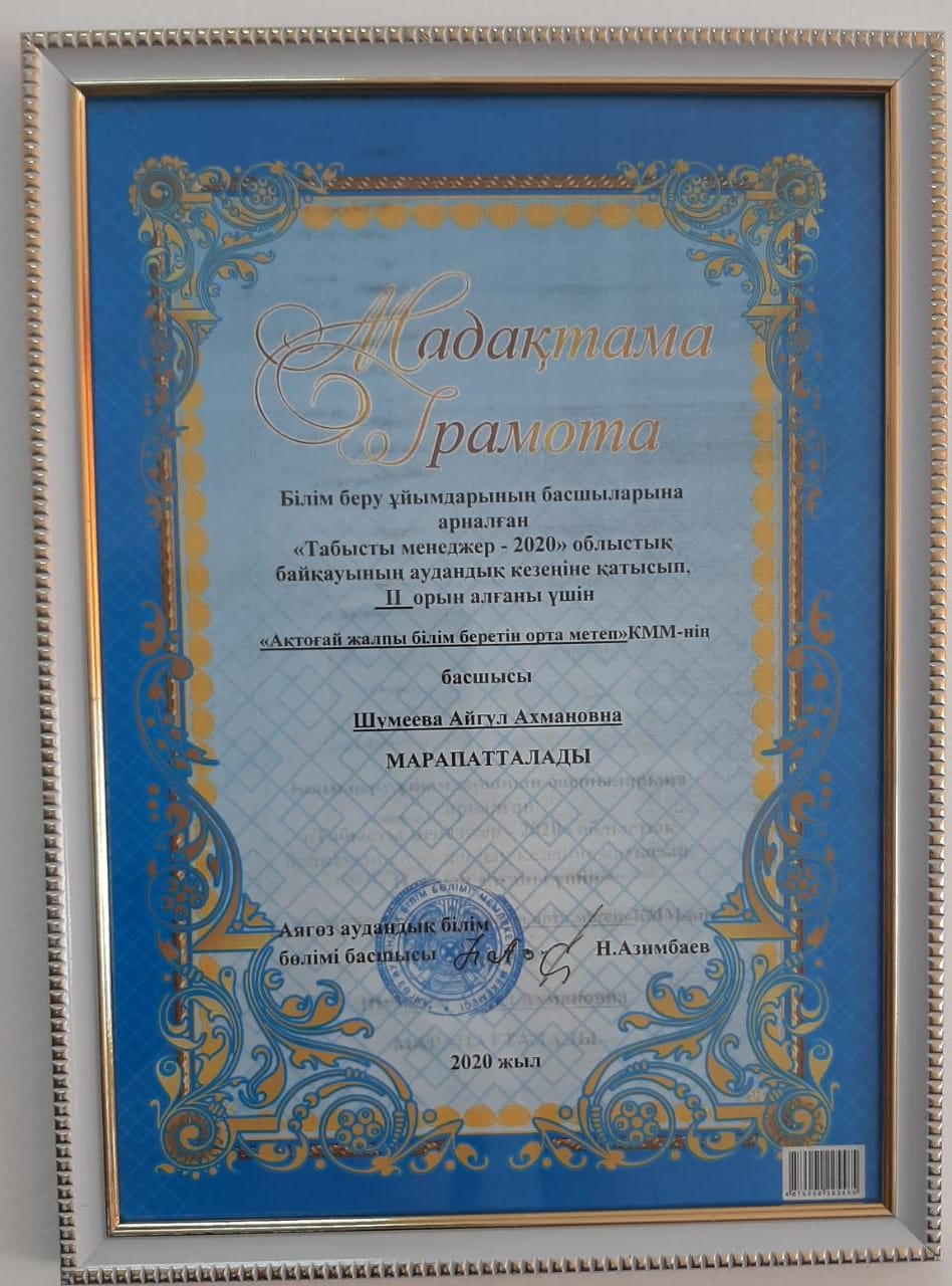Білім беру басшыларына арналған "Табысты менеджер - 2020" облыстық байқауының аудандық кезеңінде ІІ орын - "Ақтоғай жалпы орта білім беретін мектебі" КММ директоры Шумеева Айгуль Ахмановна