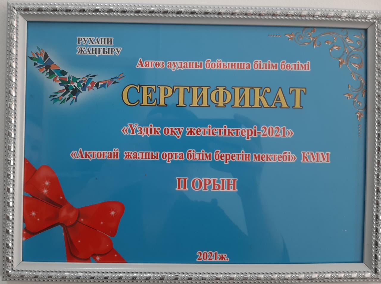 » Аягөз ауданы бойынша білім бөлімі. Сертификат. "Үздік оқу жетістіктері - 2021" "Ақтоғай жалпы орта білім беретін орта мектебі" КММ ІІ орын