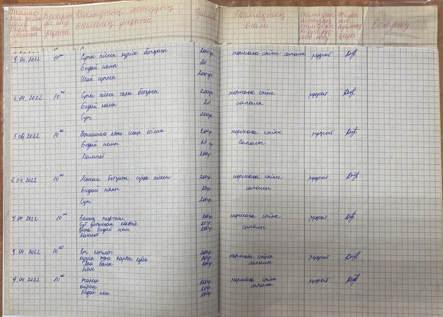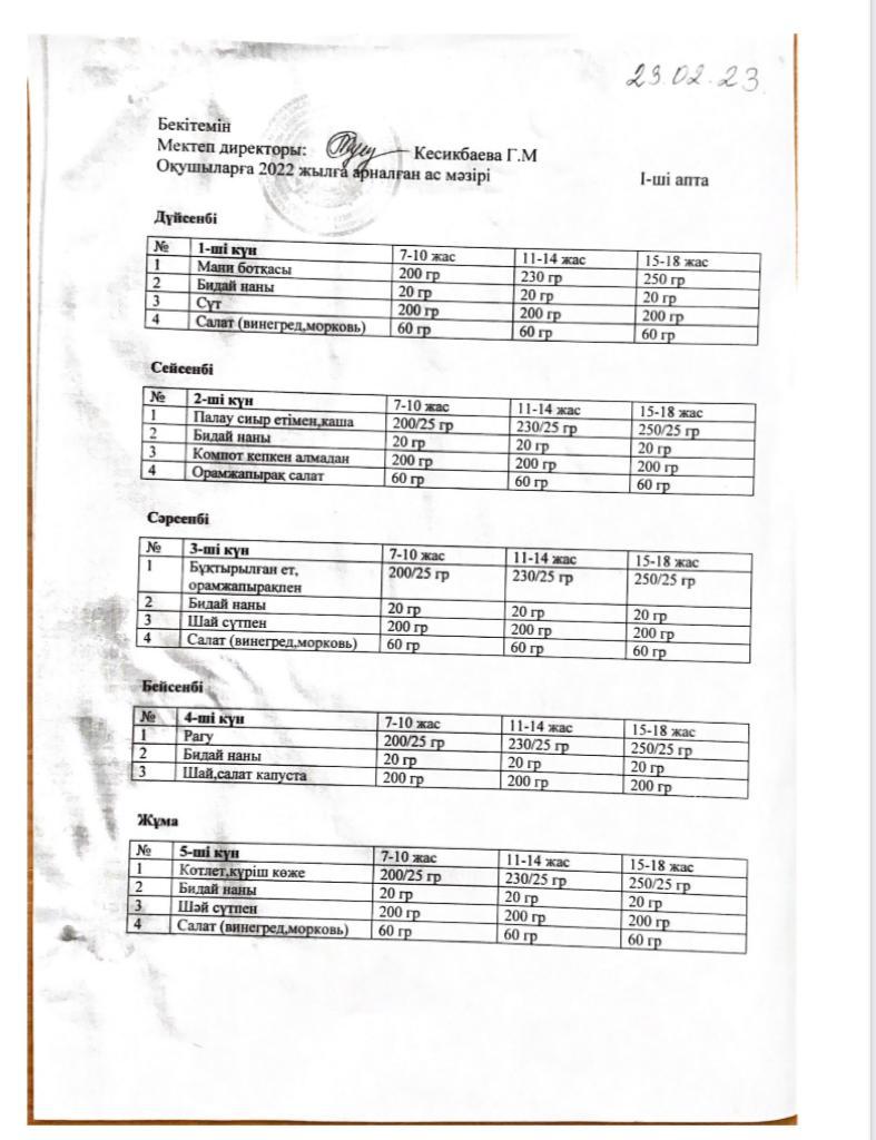 2023 жылдың 20 сәуір күні тамақтанудың сапасына мониторинг жасау үшін жүргізілген тексеруді қорытындылау комиссия шешімімен.